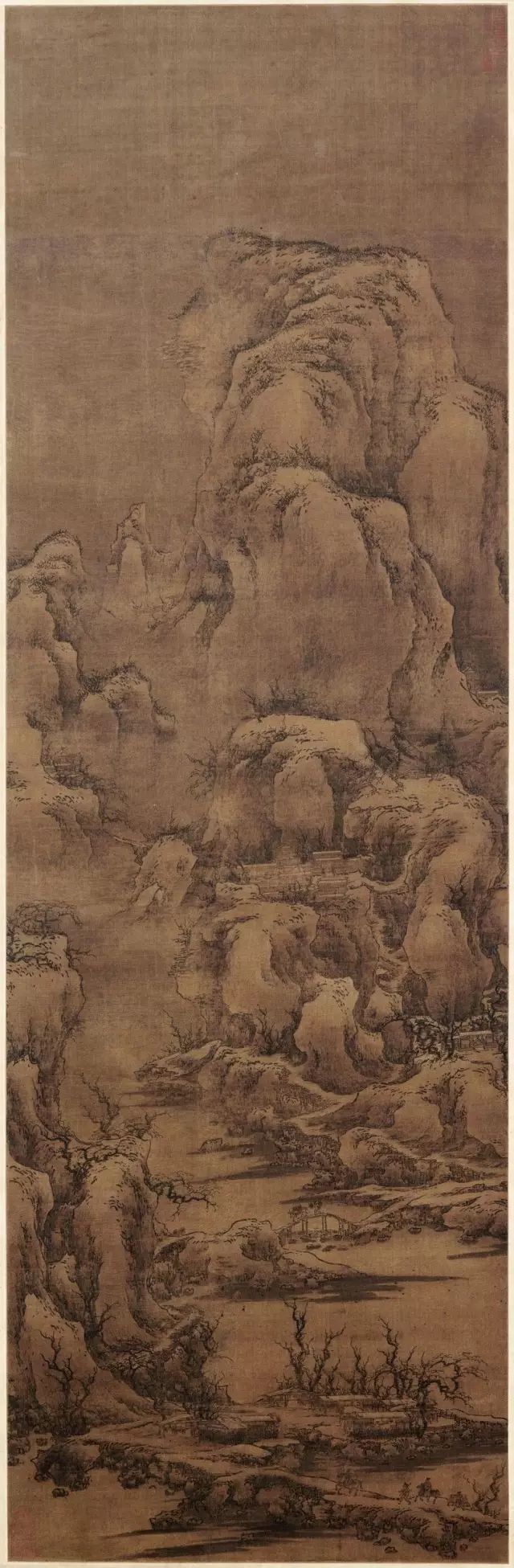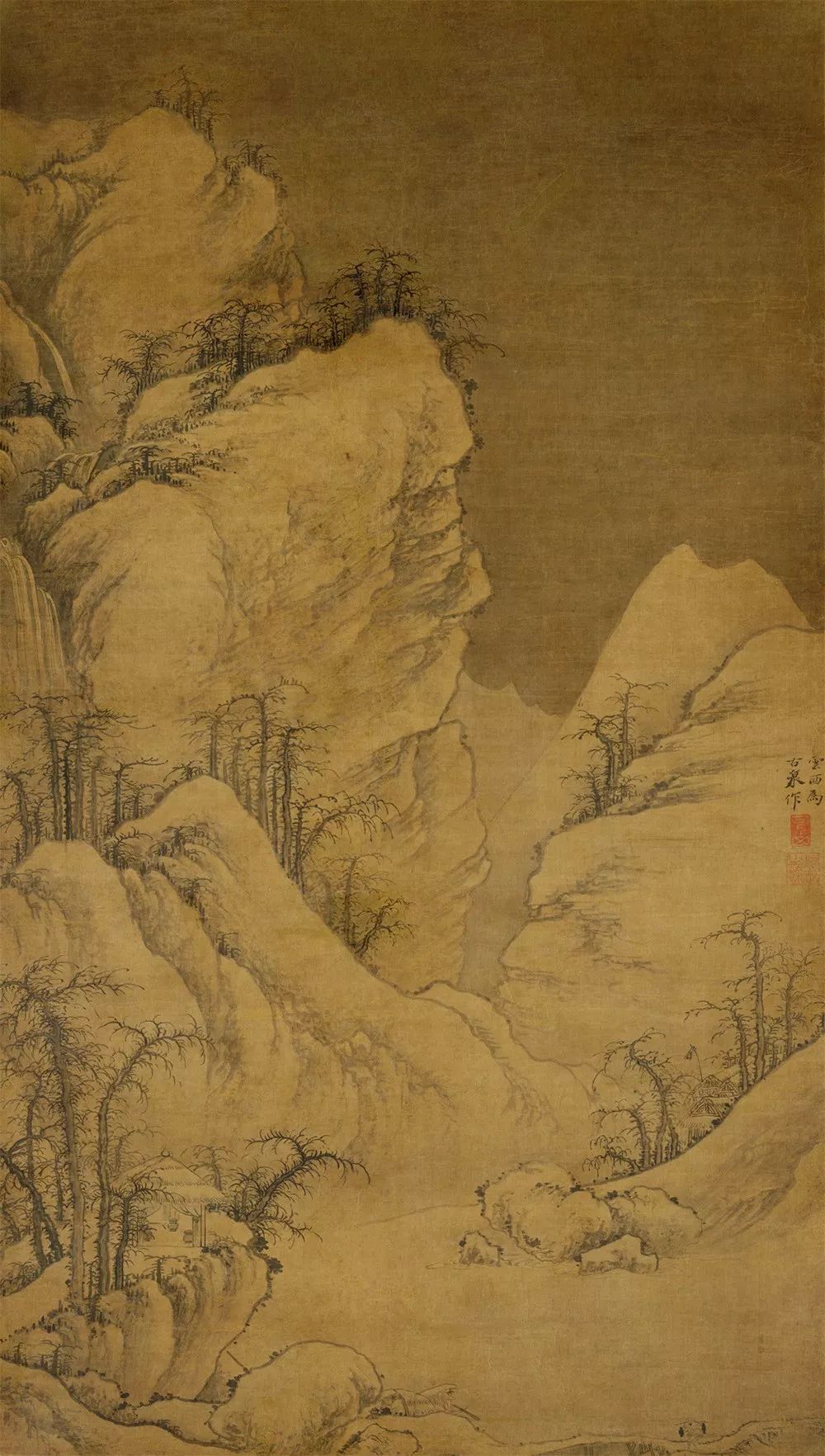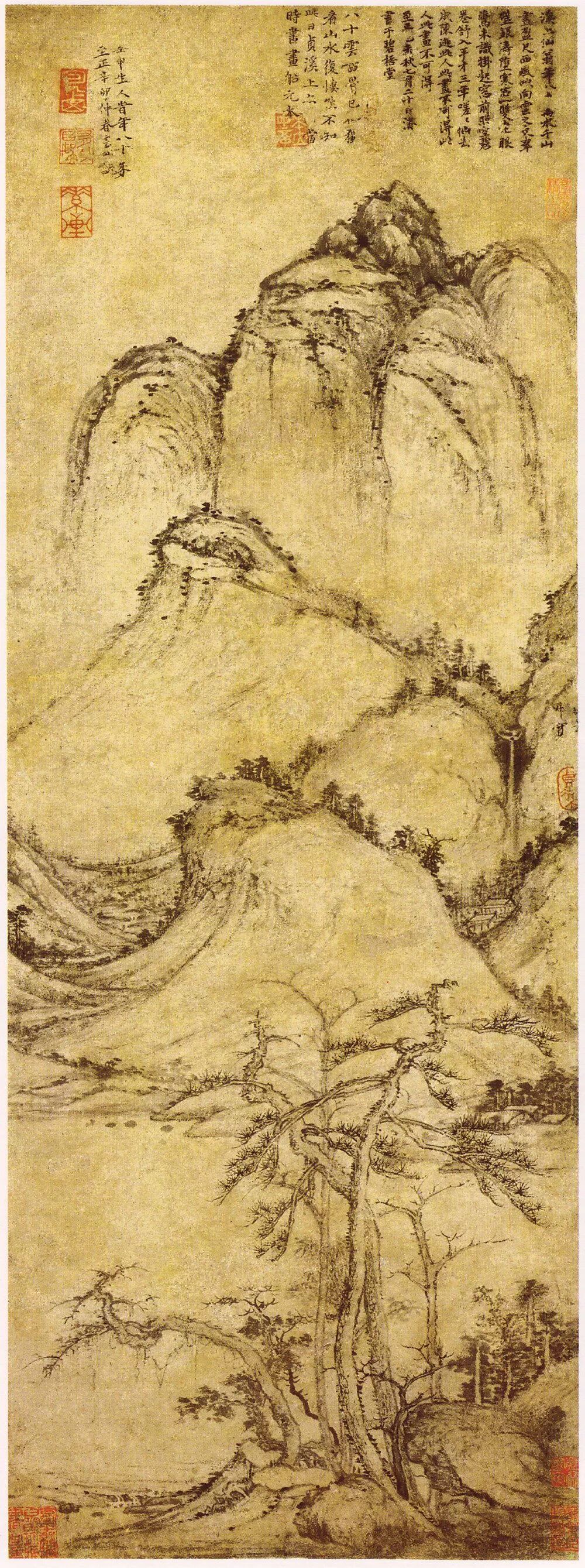 元 曹知白 疏松幽岫图 绢布 55.3X97