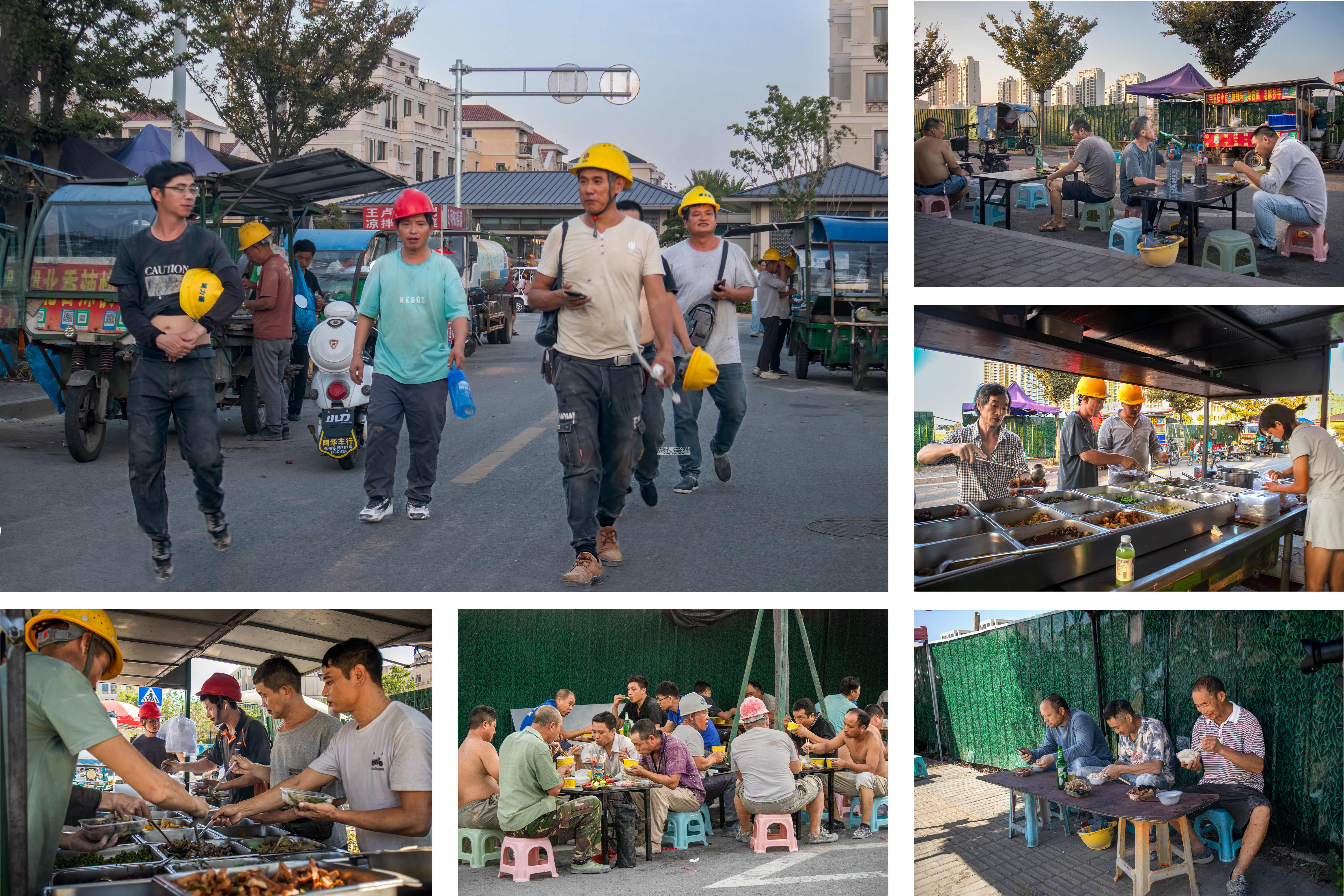 还有我的另外一幅获奖作品拍摄在乐清新湖·金色海湾施工区,工人们聚集在移动饭摊前享用午餐,这些饭摊为辛勤工作的建筑工人提供便捷、实惠的午餐选择。工人们在忙碌的间隙,围坐一起,享受简单却满足的一餐,为下午的工作补充能量。记录工人们在城市蝶变过程中的日常生活,感谢他们对城市发展所做出的贡献。