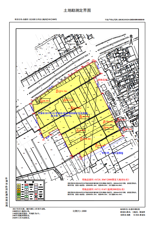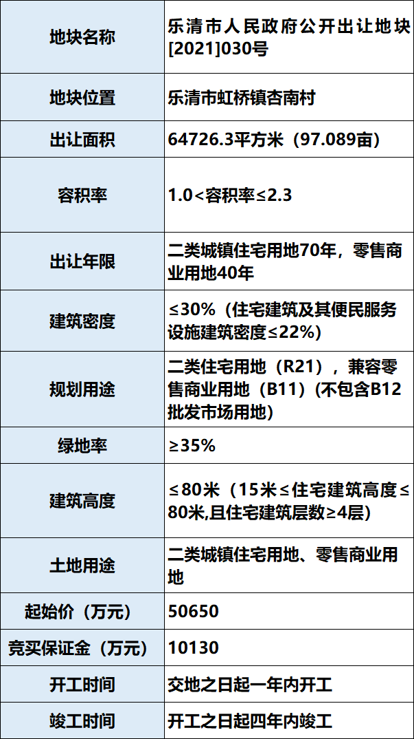 乐清市人民政府[2021]030号地块挂牌出让成功,该地块位于乐清市虹桥镇杏南村,出让面积64726.3平方米(97.089亩),土地与规划用途为普通商品住房用地(二类),成交价为50650万元,折合楼面价约为3402元/m² 。由乐清市琼宇建设有限公司竞得。