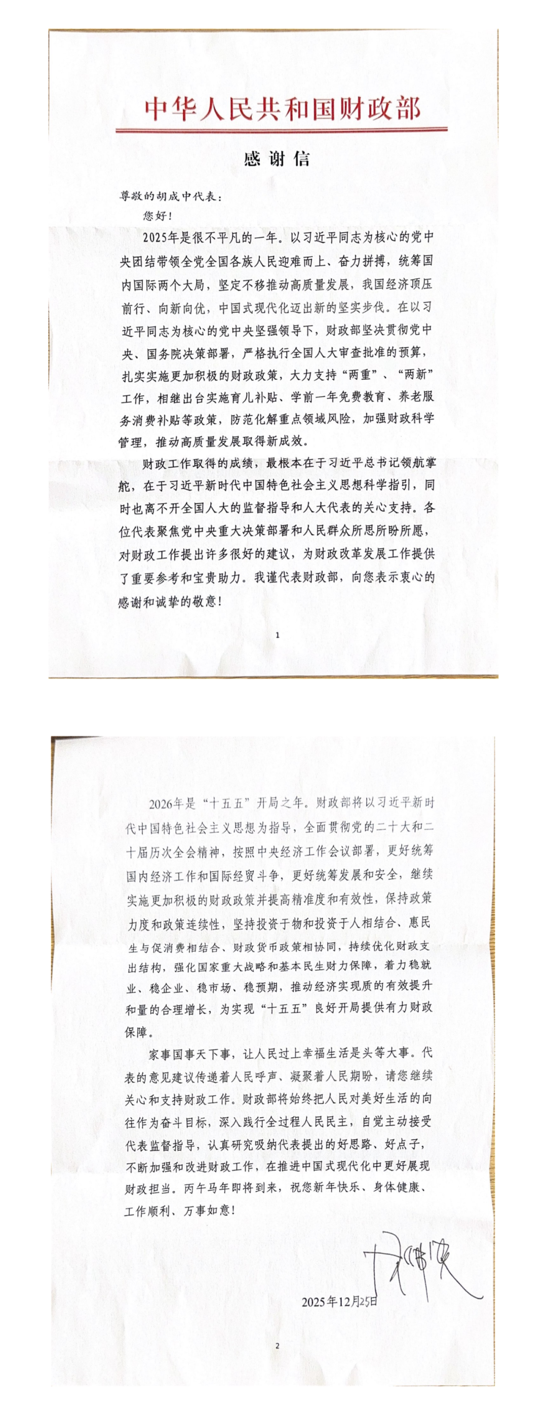 近日,财政部部长蓝佛安向全国人大代表、德力西集团董事局主席胡成中发来感谢信,感谢其对财政工作的关心与支持。 2025年全国两会期间,胡成中代表始终心系 ...